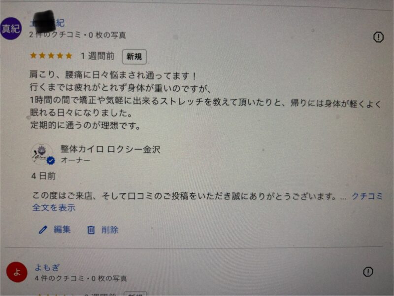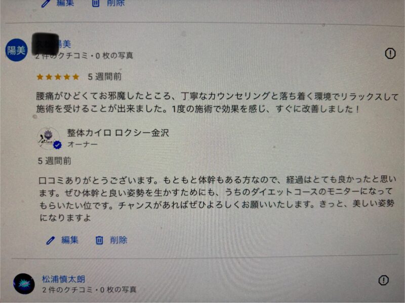 口コミの良いこちらにお伺いしました。今までの退院の施術は何度か言ってましたが、ぼんやりとした効果しか感じられず、あまり期待をしてなかったんですが、半信半疑でした。翌日、かなり痛みが取れると言うことで今までにない効果を実感しました。行くたびに痛みが取れるということでありがたいです。